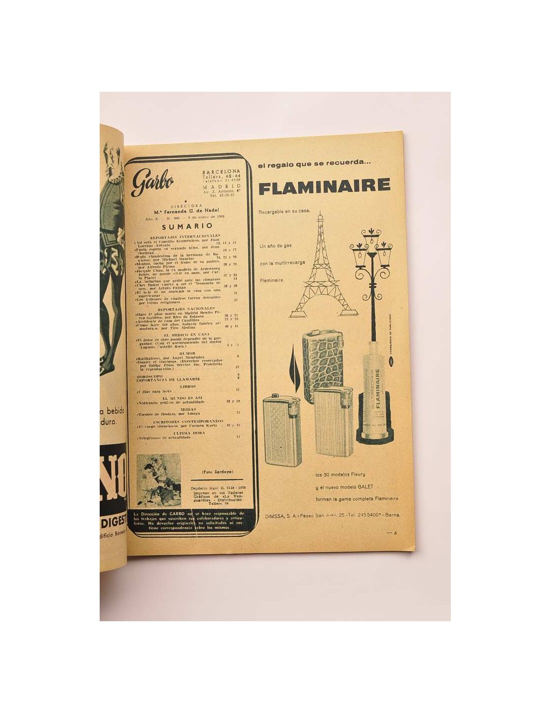 Garbo. Nº Año X., nº 460, 6 enero 1962, revista de la prensa del corazón, cuyo sumario es: